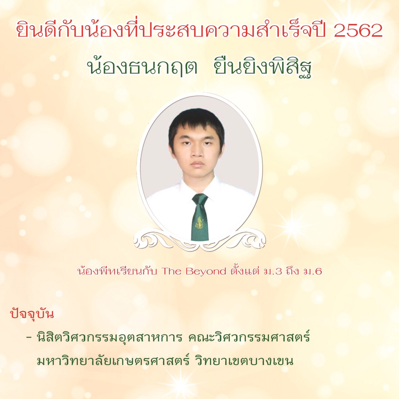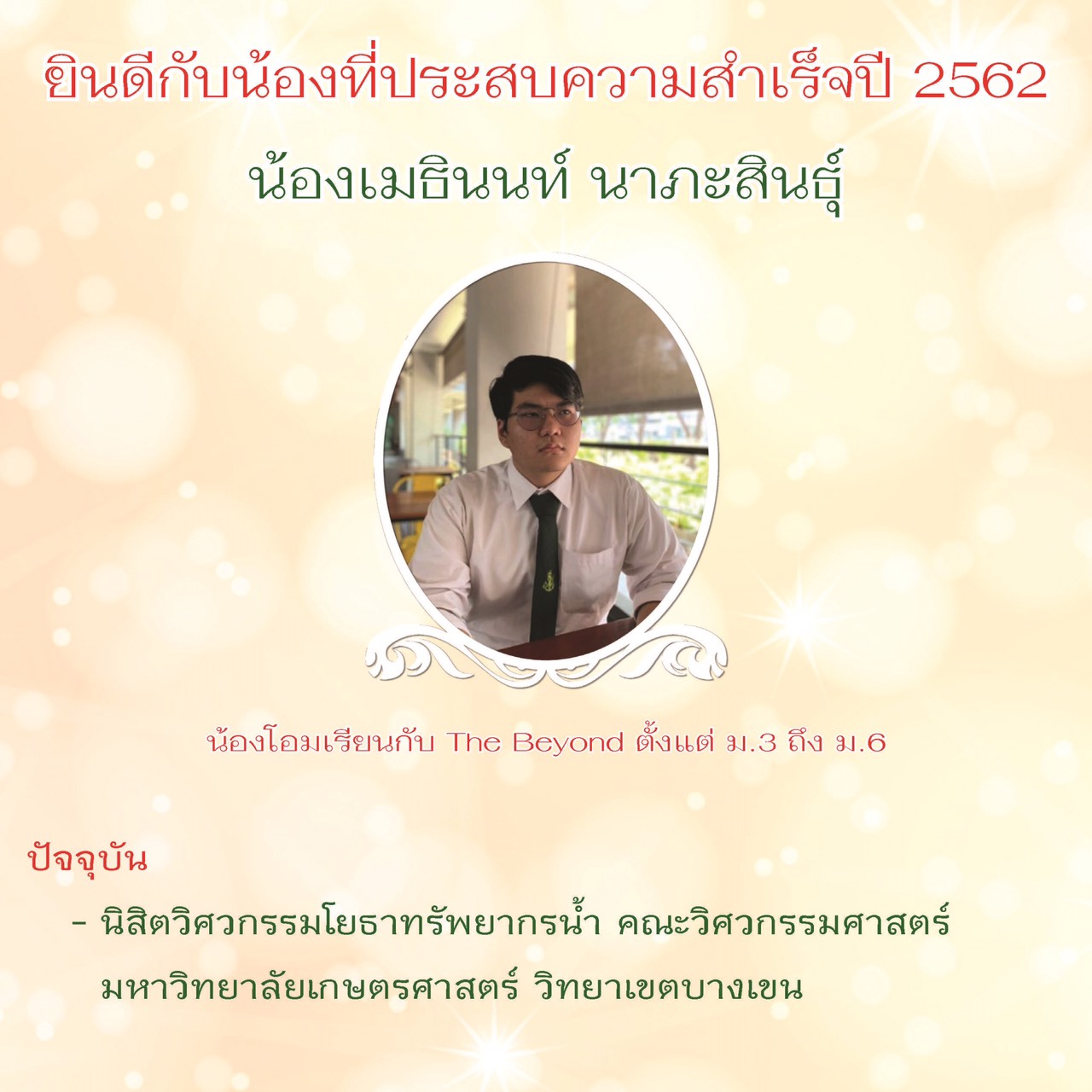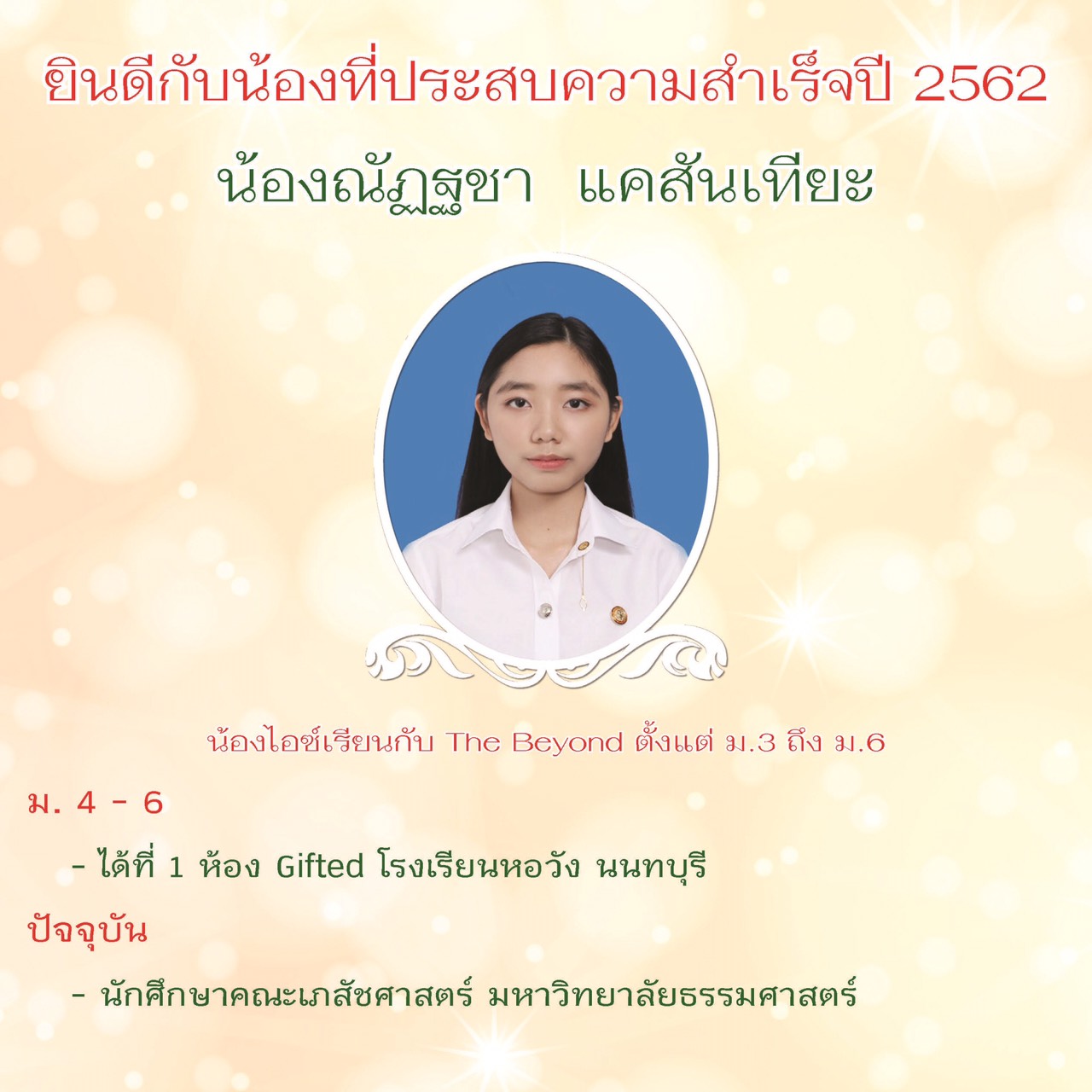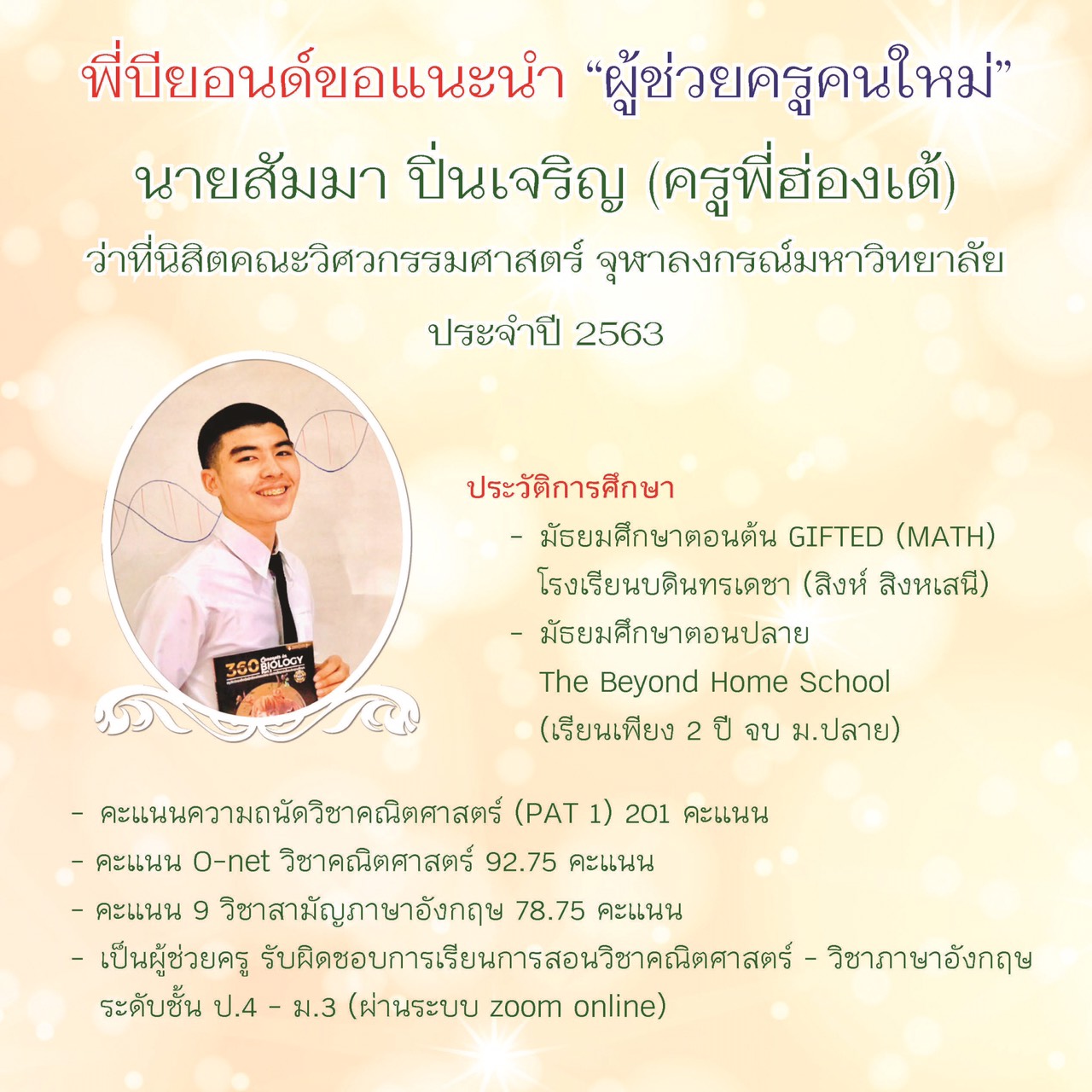 จบการศึกษา ม.3 จาก โรงเรียนบดินทรเดชา (สิงห์ สิงหเสนี) (GIFTED-MATH) เข้าโครงการ T-BAE สามารถจบ ม.ปลาย ได้เพียง 2 ปี ปัจจุบันเป็น ว่าที่นิสิตคณะวิศวกรรมศาสตร์ จุฬาลงกรณ์มหาวิทยาลัย ประจำปีการศึกษา 2563 และเป็นผู้ช่วยครูรับผิดชอบการเรียนการสอน วิชาคณิตศาสตร์ - อังกฤษ ระดับ ป.4 - ม.3 ผ่านระบบ zoom online ตั้งแต่ปีการศึกษาหน้าเป็นต้นไป